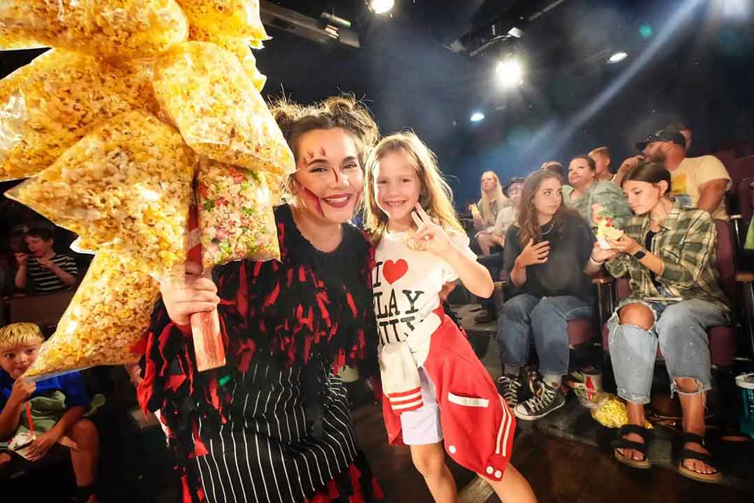 A night at The Playmill is so much more than a show. The fun begins the moment you walk through the doors, where a Playmill Player escorts you to your seat, answers questions, and gets the evening started with energy and warmth. Arrive at least 30 minutes early to catch the famous Playmill preshow — a lively mix of music, dance, and audience interaction that sets the tone for the magic ahead. A sing-along kicks off the main performance, and birthdays and anniversaries are celebrated right from the stage.